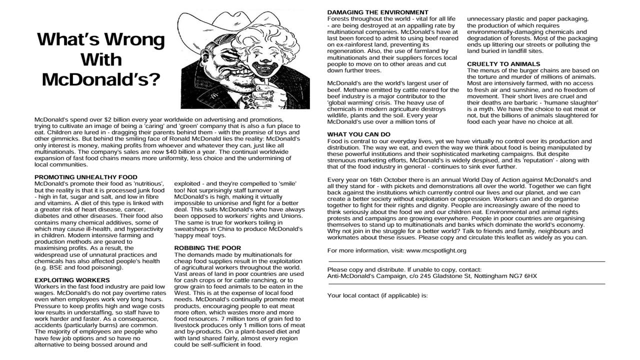 In 1986, members of London Greenpeace, published a leaflet entitled ‘What’s wrong with McDonald’s?’